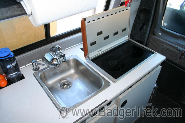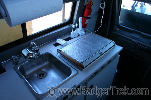 Sportsmobile Appliances: (furnace, stove, fridge, coolant/water heater)How it came: For our basic appliances we had the van outfitted at Sportsmobile with an Espar diesel powered Airtronic furnace and an Espar Hydronic coolant heater that has the coolant run through a heat-exchanger for the potable water system as well. For cooking we installed a Wallas Diesel cooktop we purchased from a boat supply house. The toilet is a Thetford electric Porta-Potty provided by Sportsmobile. So far the diesel powered appliances have all operated well at up to 10000' elevation, even though they only seem to document operation at lower elevations (especially the stove). Above 10000' we begin to have issues with the furnace and the cooktop wherein they will flame out at low heat settings. They do restart after being turned off for a few minutes and run at higher output settings though, so this is not a very big deal. Furnace:The cabin heat is provided by an Espar Airtronic Diesel powered heater. It produces plenty of heat to keep us warm and toasty even down to the negative single digits F (which is as cold as we have been so far). Fuel consumption is negligible and it does not produce very much noise at any but the highest setting. The unit is located under our sofa just behind the driver's seat, with a short output duct to the front of the sofa facing the main isle. The controller for the furnace is located on the headliner above the sofa along with a selection switch to choose from a low (0-5000') and high altitude (5000'+) fuel pumps. The fuel pumps themselves were located near the fuel tank filler bolted to the skin of the van just inside the rocker panel on the driver's side. Issues: There was no insulation behind the furnace thermostat, so the thermostat would stay cold even when the interior heated up significantly, causing some very significant temperature swings inside the cabin when the furnace was needed. The Fuel pumps for the furnace were bolted with self-tapping screws to the van body, resulting in an amplification of their "clicking" noise into the cabin when running. Changes: Insulation was placed in the gap behind the sofa side headliner so that the thermostat would react more reasonably to interior temperatures (it worked well, though I am unsure of why: Espar literature us unclear as to the location of the current temperature input (in the dial, or the air-intake to the burner), so the other insulating tasks done at the same time may have impacted this as well). Fuel pumps & lines were moved into the cup of the frame-rail between the frame rail and the fuel tank. Lines and pumps are now protected from debris, and the pumps are barely audible outside the van, and not-at-all inside the van. In mid 2006 Sportsmobile sent us a temperature probe for the furnace so the heater could sense the temperature in the cabin directly. (It normally senses the temperature based on the air coming into the furnace itself). I installed the probe, but could not really tell how it worked till the temperature cooled. It did change the behavior in that the furnace no longer always ran the fan even when not heating. Once the weather cooled we found that with the probe plugged in the van temperature would have to drop about 12 degrees before the furnace would run. It would then heat the cabin about 12 degrees before shutting off. With the probe disconnected the variation was only about 3 degrees. Needless to say we leave it unplugged now. This appears to be an Espar issue and I will try to contact them. Coolant Heater:Sportsmobile installed an Espar Hydronic Coolant Heater. The coolant heater is used to pre-heat the engine coolant when the vehicle is in very cold conditions and needs heat to help start. The heated coolant is also piped through a heat-exchanger for the hot-water side of the potable water system. Unlike the furnace there is only one fuel pump, and it is integrated into the body of the coolant heater itself. Issues: The controller for the coolant heater is located on the headliner behind the sofa, at a height that my head tends to bump the "ON" button, which I use to notice from the diesel fumes that would draft inside as it fired up, but now I need to really listen for it since the cabin has been sealed up significantly. The plumbing for the heat-exchanger, and the heat-exchanger itself were mounted under the van inside the driver's side rocker panel. This put the pipes at great risk of damage and freezing. The fuel line to coolant heater was pinched by a chunk of sharp angle-aluminum used to keep it out of the way of the house-battery. When I got to it the fuel line wall was cut about 1/2 of the way through, and probably would have begun leaking very soon. As delivered, after running the coolant heater for an hour, the engine should be fairly warm. Feeling the block would reveal it to still be cold, though the radiator top and other coolant pipes that are outside the thermostat-closed circuit were hot to the touch. When the engine was started (not noticeably easier in the cold) the temperature gauge initially read about 1/3, but quickly dropped to 0. This made me suspect that the coolant heater was not plumbed in the most optimal way. Some investigation here of the hose routing explained the unimpressive performance. With some poking around I could see that the hydronic inlet was plumbed to the inlet of the heater-core, and the outlet of the hydronic was plumbed to the outlet of the heater-core. A quick look at the van's coolant schematic (in the Ford "coffee-table" book on the 6.0L engine) shows that the only paths the heated coolant would take were either through the heater core (potentially making the cabin of the van warm, but not heating the engine-block), or through the water-pump housing (again not heating the engine block) which could begin to open the thermostat, dumping heat to the radiator as we experienced. There was no reason for any of the warmed coolant to flow through the engine 